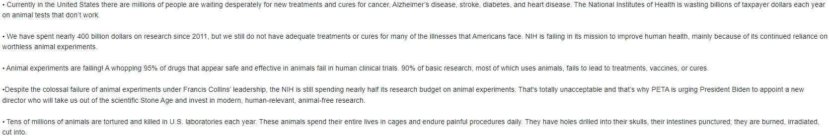 PETA either doesn't understand chemistry and biology or deny it in order to weaponize reality for their agenda. They note that 95% of drugs fail in human clinical trials and 90% of basic research never leads to treatments, vaccines, or cures.