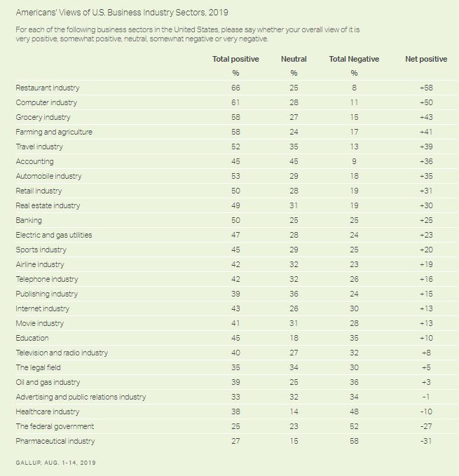 I'd rather light a candle for companies than just curse their darkness, of course, so I will note that the top most trusted industries are computers (which includes Microsoft, once the Source Of All Evil when Bill Gates ran it, and Facebook and Amazon and Google, where Jeff Zuckerberg and Jeff Bezos and everyone at Google are currently the Source of All Evil) and restaurants, where even Chipotle lying about being non-GMO while poisoning its customers has not brought the whole group down the way generic companies Teva and Mylan and Heritage Pharmaceuticals have killed the reputation of drug companies.