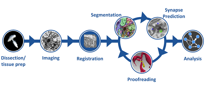 The hemibrain connectome and its clock neuron circuity contains around 25,000 neurons, which can be grouped into thousands of distinct cell types spanning several brain regions and is the largest synaptic-level connectome ever created. It covers central fly brain circuits critical for associative learning and fly navigation.