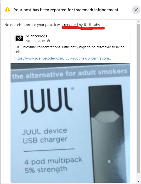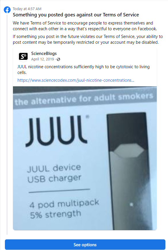 Today on the Facebook page of Scienceblogs, I found out their marketing team or independent contactor SEO experts had filed 283 "copyright infringement" complaints about our posting a science article on chemicals in vaping - from 2 years ago.