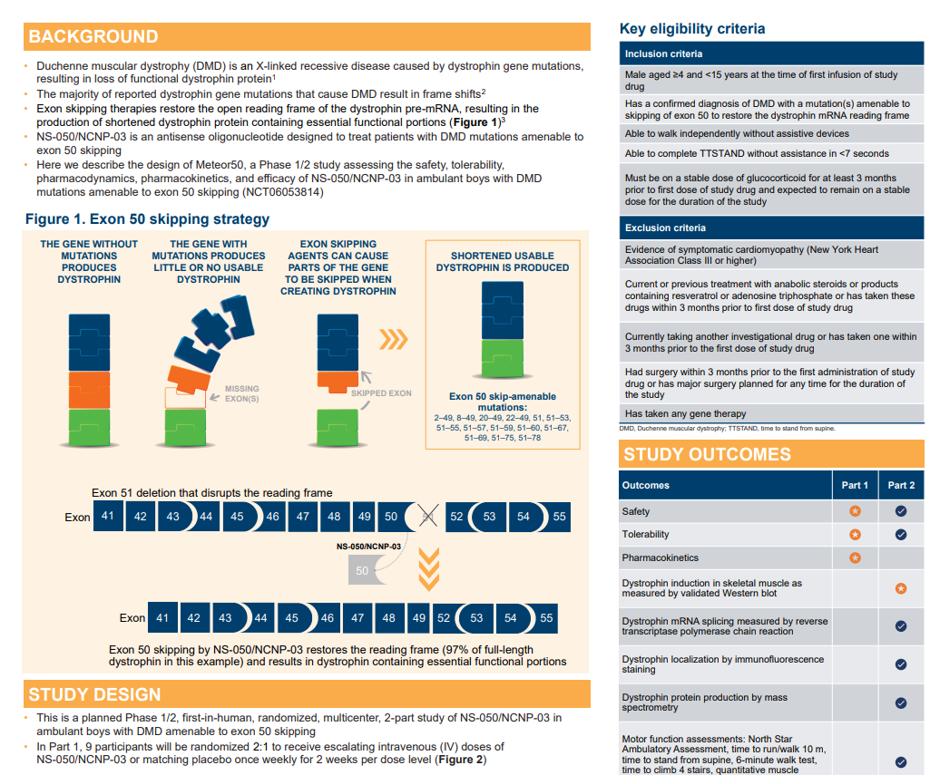 Duchenne is a muscle wasting disease that occurs primarily in males and is caused by a deficiency of the dystrophin protein. There are many types of genetic mutations that can cause Duchenne, and NS-050/NCNP-03, an antisense oligonucleotide, is being developed to treat patients with confirmed gene mutations amenable to exon 50 skipping therapy. NS-050/NCNP-03 skips part of the genetic information of the dystrophin gene and produces a functional dystrophin protein with a slightly shorter chain length, which is expected to have the effect of suppressing muscle function deterioration.