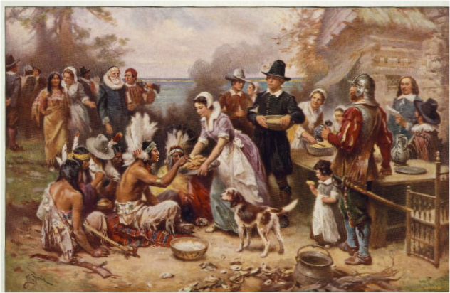 Jean Leon Gerome Ferris "The First Thanksgiving, 1621" from 1912. Coastal natives didn't wear feather headdresses but science gets pushed out of the way a lot when it comes to Thanksgiving, that is why cranberries can be blamed for the modern chemophobia that infects anto-science progressives and enables predatorts suing over everything, while organic food is believed to be healthier but actually leads to higher toxic chemical levels in people.