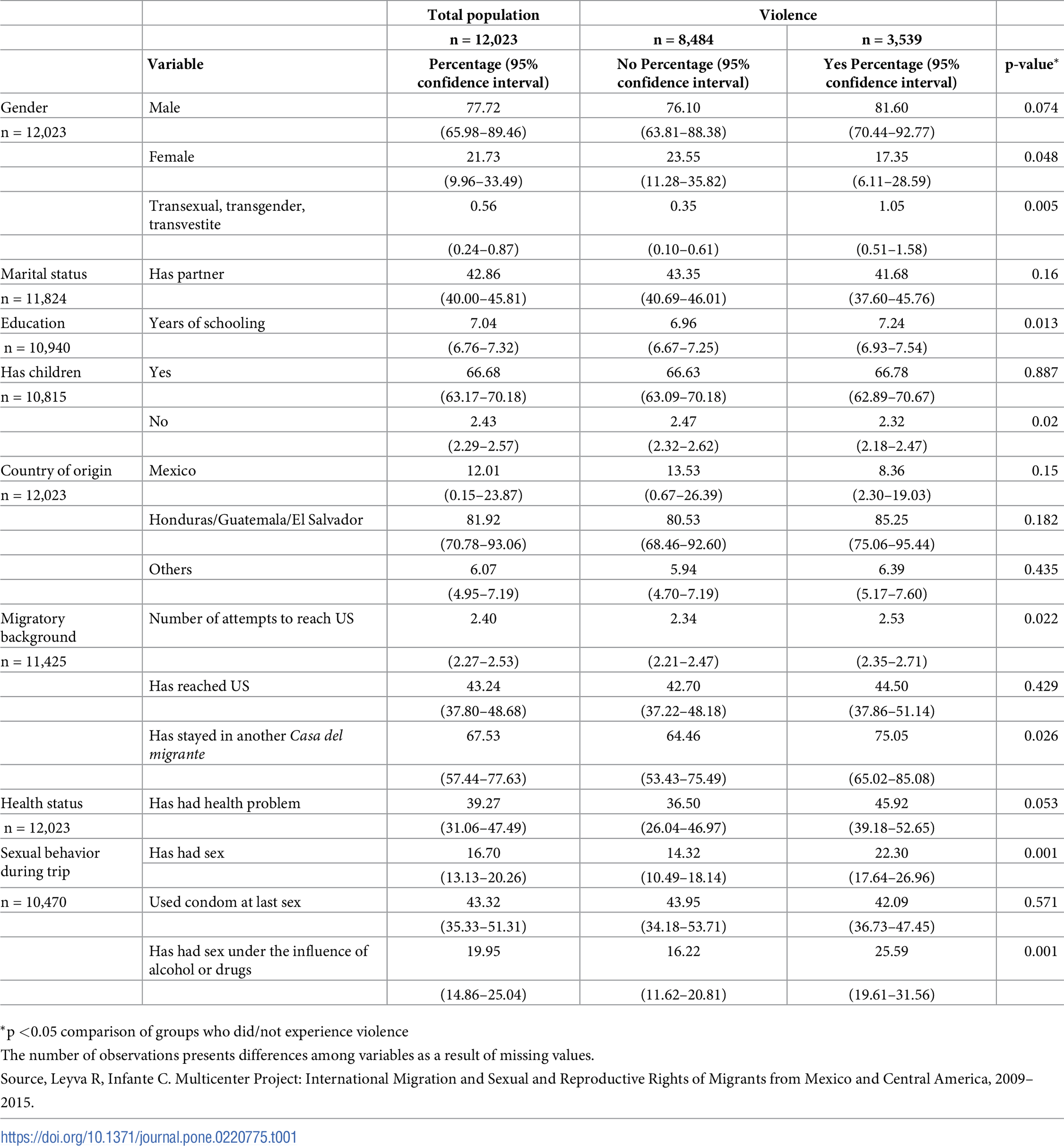 But surveys of 12,023 migrants traveling through Mexico to get to the US between 2009 and 2015 found that almost 30 percent had experienced some form of violence. Among those surveyed, 24 percent reported physical violence, 19 percent reported psychological violence, and approximately 2 percent reported sexual violence. Transgender, transsexual and transvestite migrants experienced a significantly greater burden of overall violence, and both this group and women experienced a significantly greater burden of sexual violence compared to men.