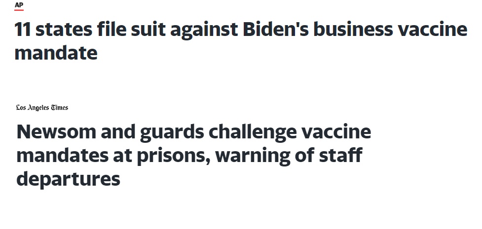 In the two headlines above, the motivation for Republicans and Democrats is the same: Protecting their interests, not the public. Businesses see the costs of enforcing a mandate for vaccines when there is already "stagflation" - inflation leading to higher costs but a stagnant economy - while Governor Gavin Newsom wants to show a union he is even willing to look like a Republican and oppose mandatory vaccines if it means they keep funding him.