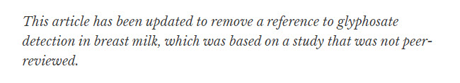 It's why an editor had no problem at all letting a commentary which claimed that the weedkiller glyphosate, once made by Evil Monsanto - the now gone boogeyman of anti-science progressives - was found in breast milk and therefore was probably causing cancer or autism or whatever