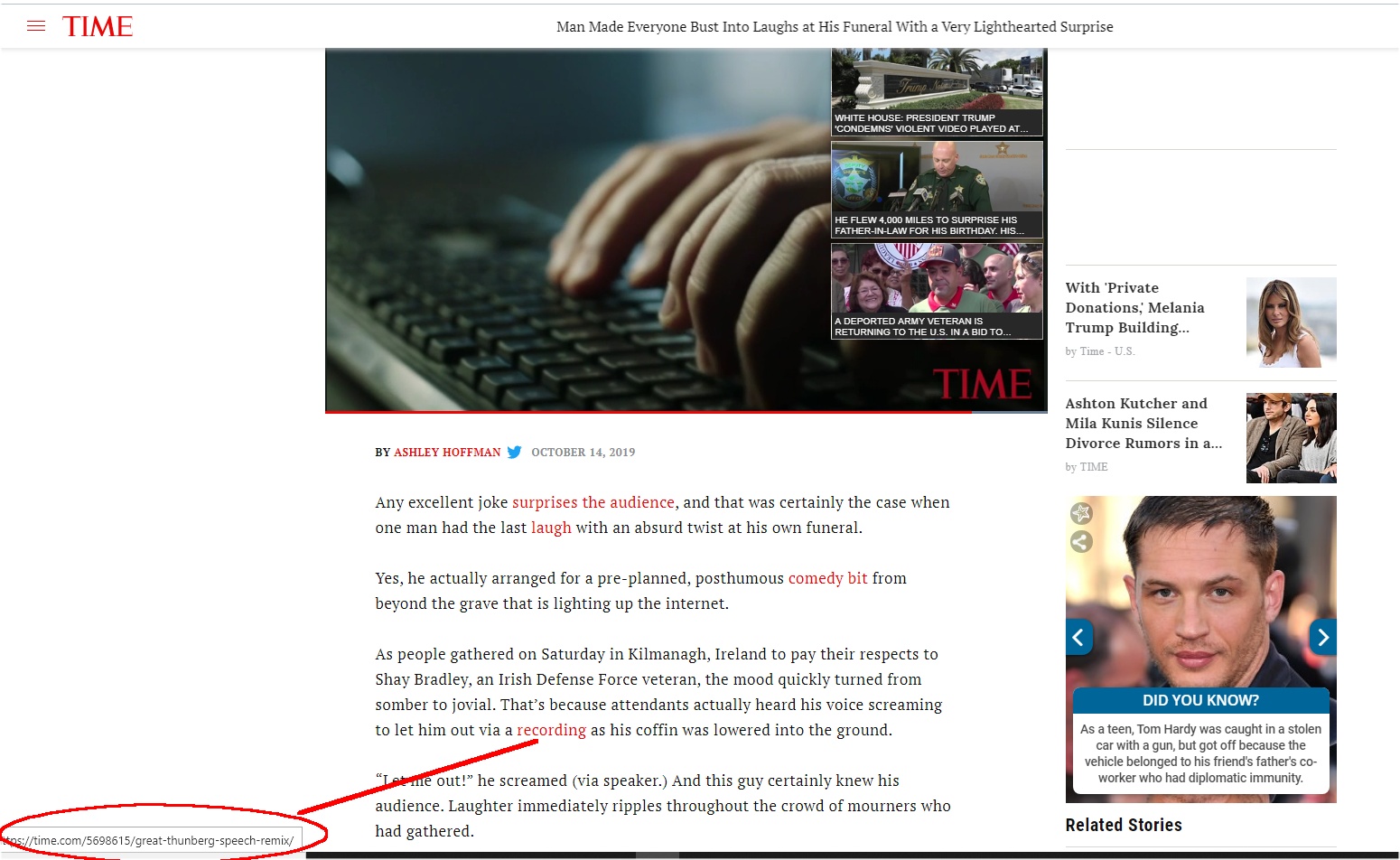 The coffin lowering recording link was a remix of Greta Thunberg speeches. Except of course it wasn't, outside TIME magazine. I checked again to make sure I wasn't crazy and that TIME had actually provided a URL of a Greta Thunberg speech in a sentence about lowering someone in a coffin.