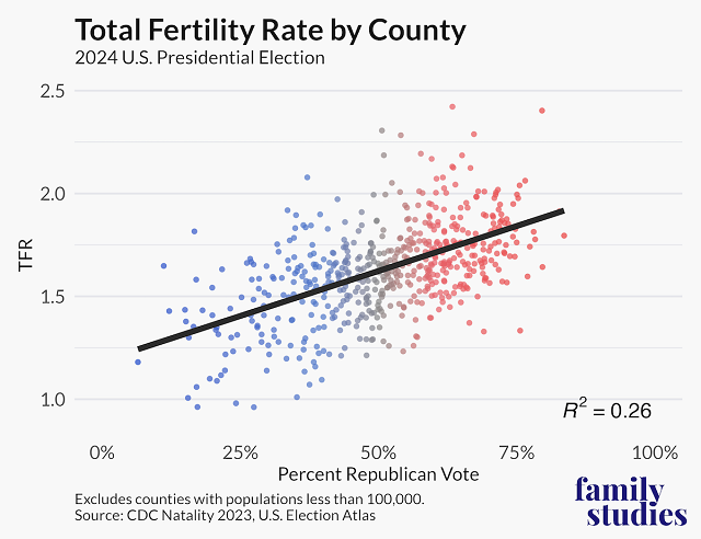 It is a trend, not a blip. As the authors note, "in 2012 just 8% of the variance in fertility between counties was accounted for by vote share, that number has grown to 26% by 2024."