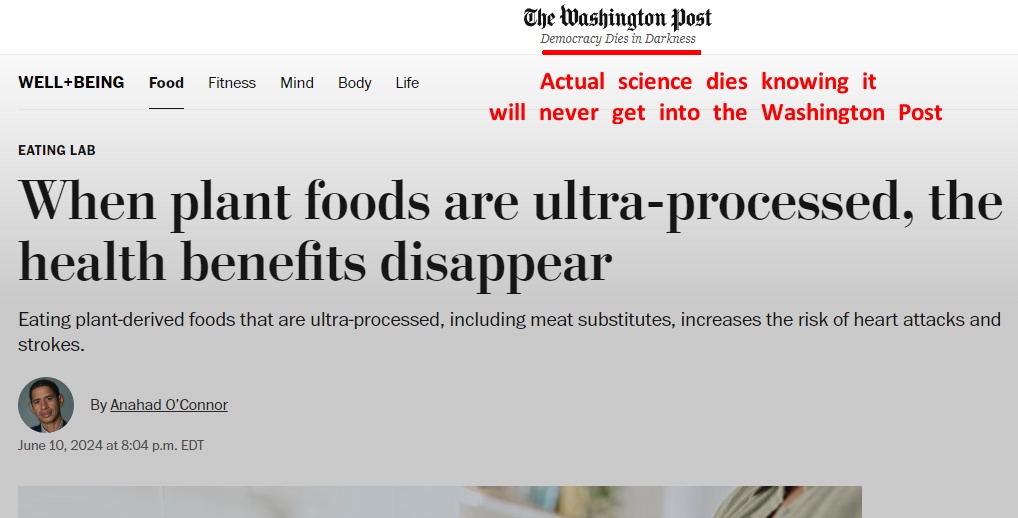 It is no surprise that neither editors at the journal or journalists at the paper read far enough to see vegan processed food was irrelevant. This is the same Washington Post where journalists are rending garments because an editor asked them to stop writing nonsense. This is the same Lancet that published a paper claiming vaccines cause autism.