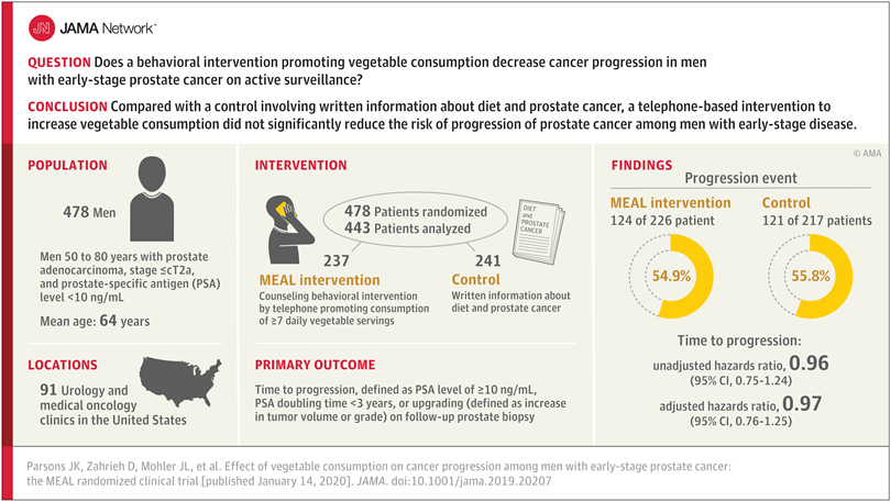 Citation: Parsons JK, Zahrieh D, Mohler JL, et al. Effect of a Behavioral Intervention to Increase Vegetable Consumption on Cancer Progression Among Men With Early-Stage Prostate Cancer: The MEAL Randomized Clinical Trial. JAMA. 2020;323(2):140–148. doi:10.1001/jama.2019.20207