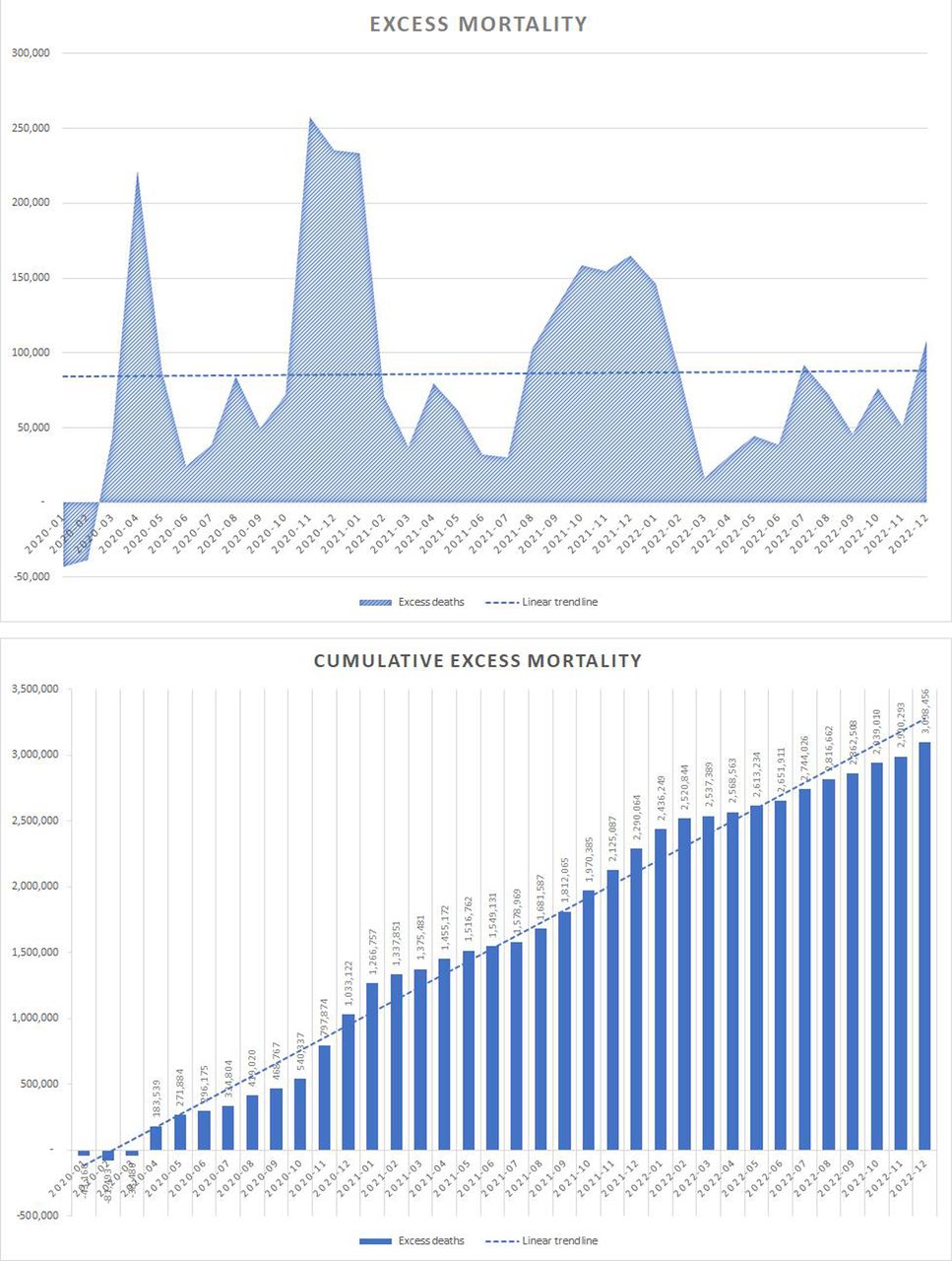 Excess mortality and cumulative excess mortality in 47 countries of the Western World over the years 2020, 2021 and 2022. The linear excess mortality trendline is almost horizontal. Credit: BMJ Public Health from Our World In Data information