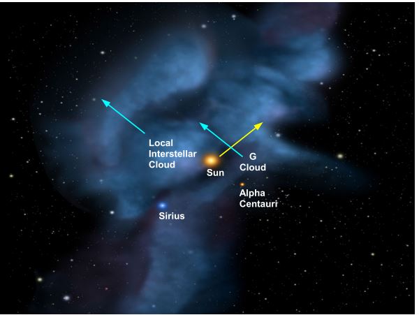 An illustration of the solar neighborhood and nearby clouds within a distance of about 10 pc. Our Solar System is located inside the Local Interstellar Cloud and near the G-Cloud, which are embedded in the larger Local Bubble with a diameter of about 100 pc. The relative motion of the clouds (blue) and the general motion of the Solar System (yellow) are indicated. Figure adapted from NASA/Goddard/Adler/U. Chicago/Wesleyan.