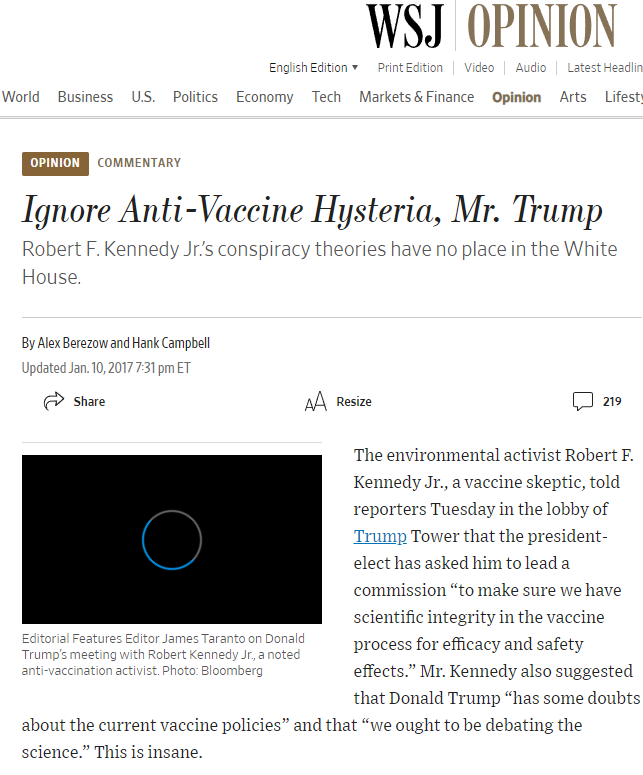 Fast forward to 2017 and my co-author of the bestselling "Science Left Behind", about the decline in scientific decision-making in the Obama years, got an email from the Wall Street Journal asking us for thoughts about President-elect Trump meeting with Kennedy about vaccines.