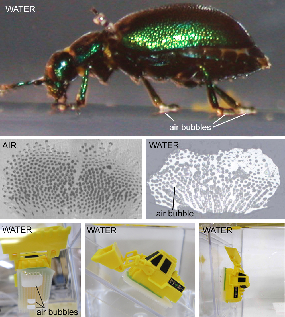 Top: The beetle walking under water (white arrows indicate trapped air bubbles). Middle: Beetle feet attached to a surface. On the left it is surrounded by air. On the right it is under water. Bottom: A plastic toy bulldozer adhering to the substrate using the structured polymer with trapped air bubbles under water. Copyright: CAU, Source: Stanislav Gorb und Naoe Hosoda