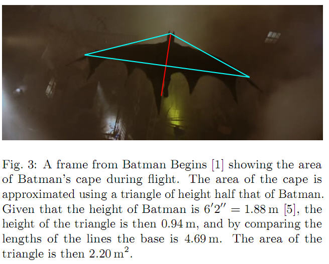 Ian Griffiths, Gareth Douglas, David Marshall, and Tom Hands aren't simply ironically griping about pop culture, they did some arithmetic and determined Batman's wingspan to be 4.7 meters. Then they calculated if he jumped from a building 150 meters in the air, he could glide for 350 meters, they say, but as he descends his velocity would increase. They see no way for him to be under 50 miles per hour when he reaches the ground, which is obviously too fast to land safely.