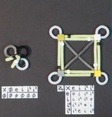 When I constructed this with a hot glue gun, it was simple enough to have six straws line up and pass through the cube which has six faces. It was appropriate to put the spatial ones there. The white and gray straws stick out from corners, hanging on to three edges with a big wad of glue.