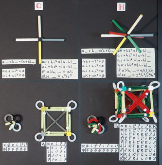 Addition requires 4 straws, one for e, i, i2, and i3 and the cube for e=0. The group Z4 has the first four elements and Z1 covers e=0. Two doublets should do the work: