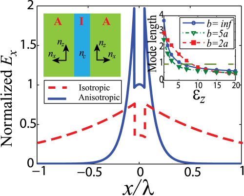 Normalized tangential electric field of the TM mode for a glass slab waveguide with a size of 0.1λ surrounded with all-dielectric metamaterial cladding. The metamaterial has dielectric constants of εx=1.1 and εz=15. On comparison with a conventional mode that has air as the surrounding medium, a rapid decay of the evanescent fields is observed. The plots are normalized to the same input electric energy. Inset: as the anisotropy of the cladding is increased, the mode length decreases significantly below the diffraction limit with completely transparent media. This can be achieved with a cladding size (width b) three times that of the core size (width a). Credit: DOI:10.1364/OPTICA.1.000096