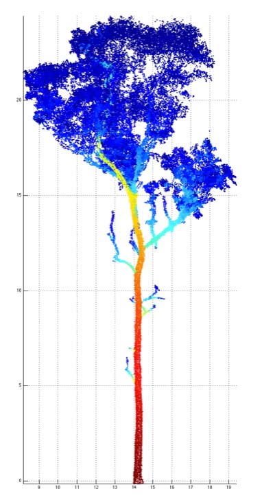 Lidar point cloud from a scanned Eucalyptus tree of about 25m in height. The colors represent the size of 'patches' used to cover the points in calculating tree volume, blue being small, red being large. Credit: UCL