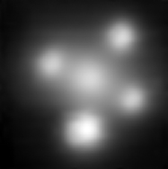 Close-up of the Einstein Cross, as observed with the SINFONI instrument on ESO's Very Large Telescope. SINFONI makes use of the adaptive optics technique and so, allows astronomers to overcome the blurring effect of the atmosphere, thereby providing very sharp images. The central blob is the nucleus of the lensing galaxy, surrounded by the four mirage images of the distant quasar.