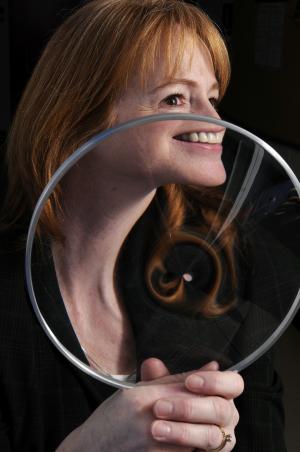 Galaxies can warp space and time, distorting our view of distant objects, much the way this plexiglass lens distorts the appearance of Evalyn Gates, an astrophysicist at the University of Chicago. Astrophysicists use this effect, called gravitational lensing, in their studies of the cosmos. Credit: Dan Dry