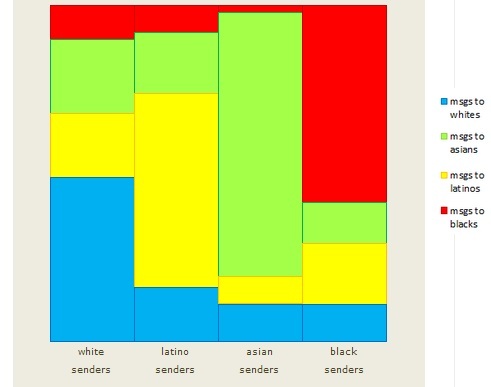 Even more disturbing from another study by OK Cupid released last year they adjusted for the fact that most people in their population are white using statistical methods. Christian Rudder was nice enough to build an interactive table which I will now borrow an image of with all races equal