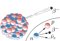Beta- decay occurs for isotopes with an excess of neutrons. During this decay, a neutron is converted into a proton (thereby changing the element) while releasing an electron and another elementary particle known as a neutrino. (N.B. The neutrino is largely irrelevant for this discussion due to the fact that they (for all practical purposes) do not interact with everyday matter.) - Beta+ decay can occur if there are too few neutrons in the nucleus. In this case, a proton is converted into a neutron while emitting a positron (same as a electron except that the charge is positive instead of negative) and a neutrino. Beta+ decay can only occur if the atom has enough energy to overcome the mass difference between an proton and a neutron. (If the atom doesn't have enough energy, a process known as electron capture occurs where a proton captures an electron to become a neutron while emitting a neutrino - this process doesn't emit anything (except the neutrino which is irrelevant) and therefore cannot be considered a form of atomic decay.)