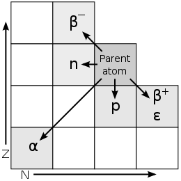 (Added during editing) During the alpha and beta forms of decay described above, the parent element will change to another element. The resulting atom can easily be determined by identifying the remaining number of protons and neutrons. The following graphic clearly depicts the outcome of these 2 types of radiation as well as the atomic changes that occur when an atom loses a proton (p) or a neutron(n). A change in the row means that a change in element.