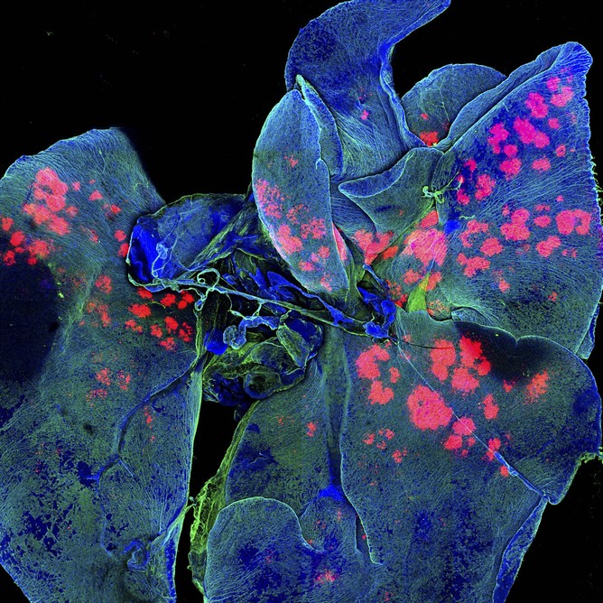 This image is one in a series we captured to examine the distribution of engineered, micrometer-sized drug particles (red) targeted to mouse lungs (blue, green). Scale in science and engineering is fascinating, and as technology has advanced, we’ve increased our ability to take both smaller and larger images with detail and range. Using fluorescent imaging and a confocal laser microscope, we imaged whole lungs at different times to determine where drug particles go.