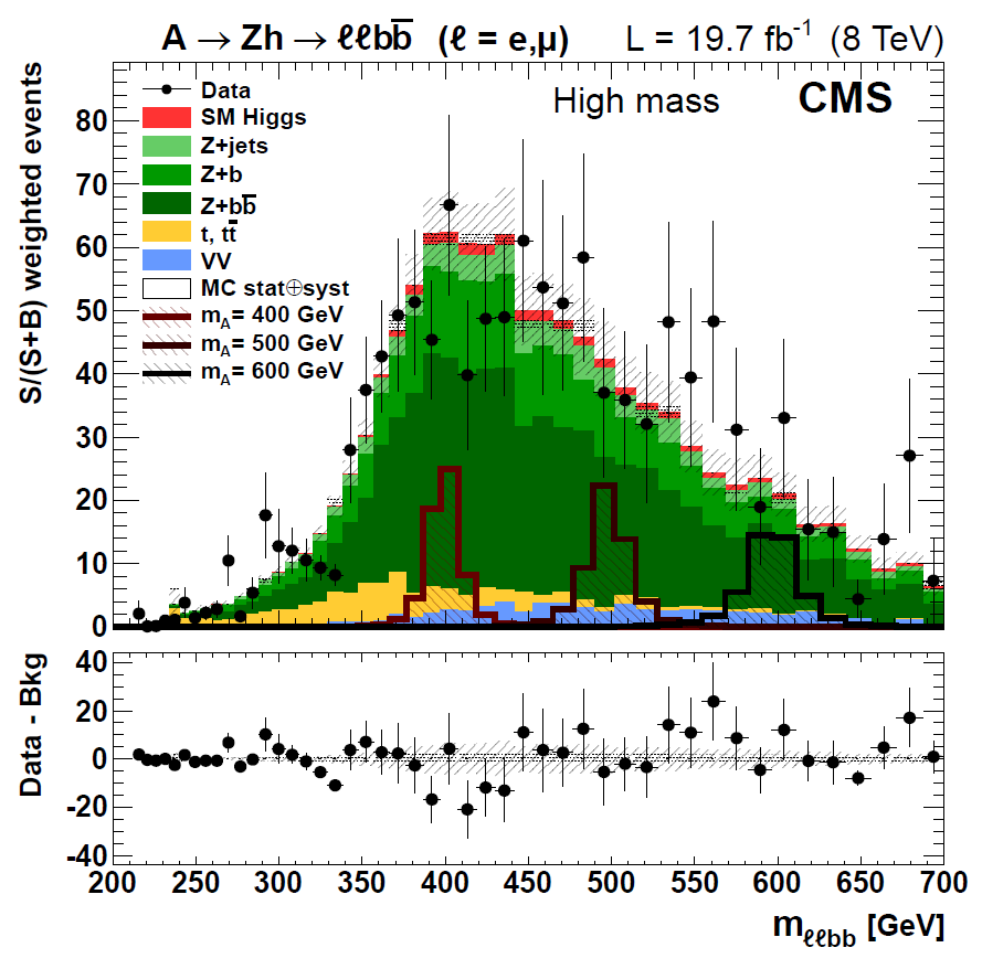 In the upper part of the graph the data (black points with uncertainty bars) are compared with expected backgrounds, that arise mainly from the production of a Z boson together with a pair of b-quarks that did not originate from a Higgs boson (in dark green). Note that the associated production of ZH pairs does contribute to the selected data, of course - it is the red histogram component; the signal of a A boson decay however would be much stronger, and would be reconstructed as a narrow peak, as shown by the three sample distributions (empty histograms) for A mass hypotheses of 400, 500, and 600 GeV. The lower graph shows the data minus expected background distribution, which has no significant deviations from zero.