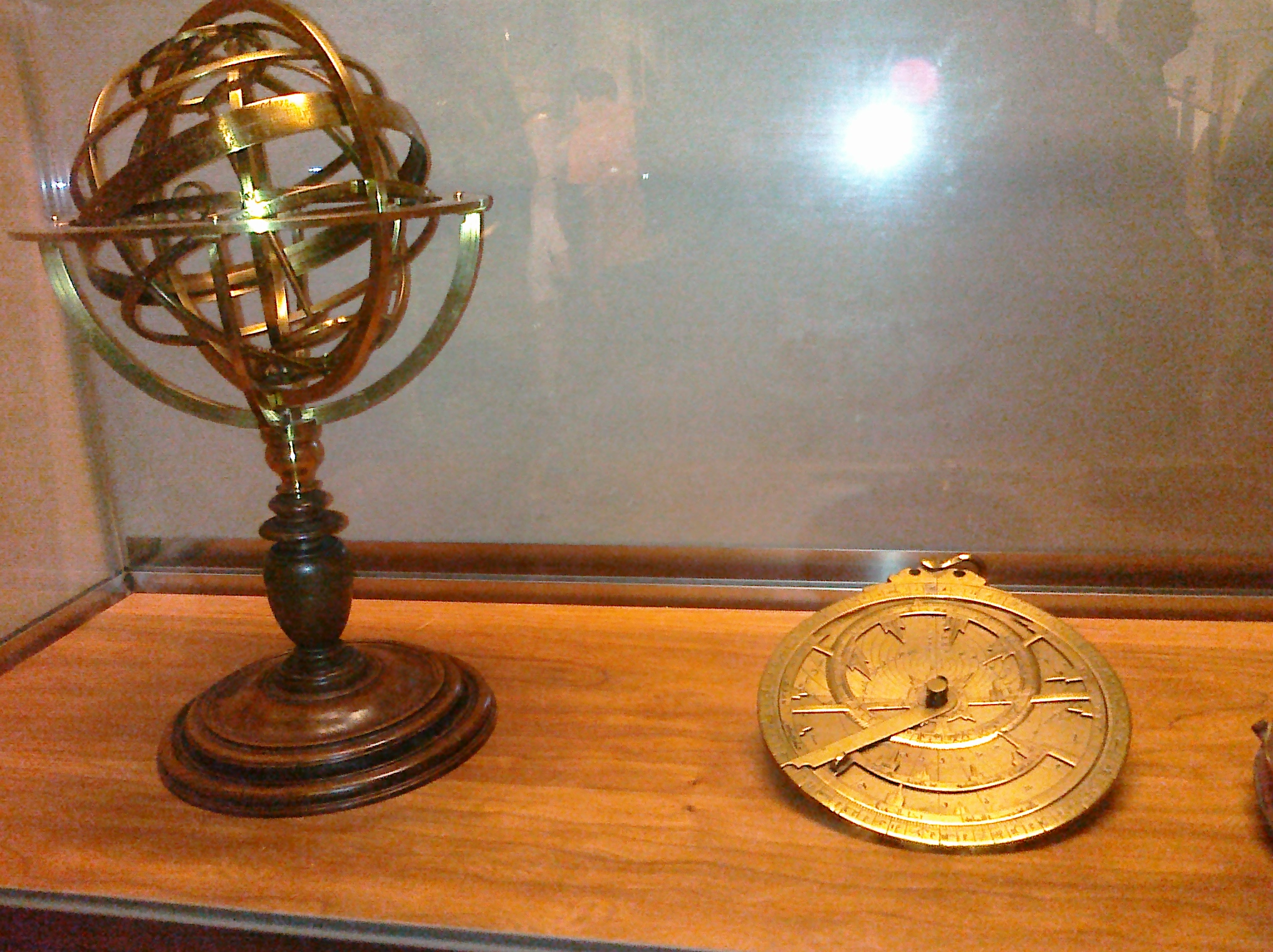 Armillary sphere, left, and astrolabe. An armillary sphere is "an astronomical instrument is used to represent the orbits of the planets, stars, and the Sun by means of rings pivoting on a common center. Typically, at the center is a large globe representing the Earth. Surrounding brass rings portray celestial coordinates, meridians, equators, and zodiac constellations." This is essentially a 3-D astrolabe. An astrolabe is "a portable astronomical calculator used to tell the rising and setting times of the sun and a number of fixed stars in a number of locations. It can also be used to determine height and distance by the geometric method of triangulation."