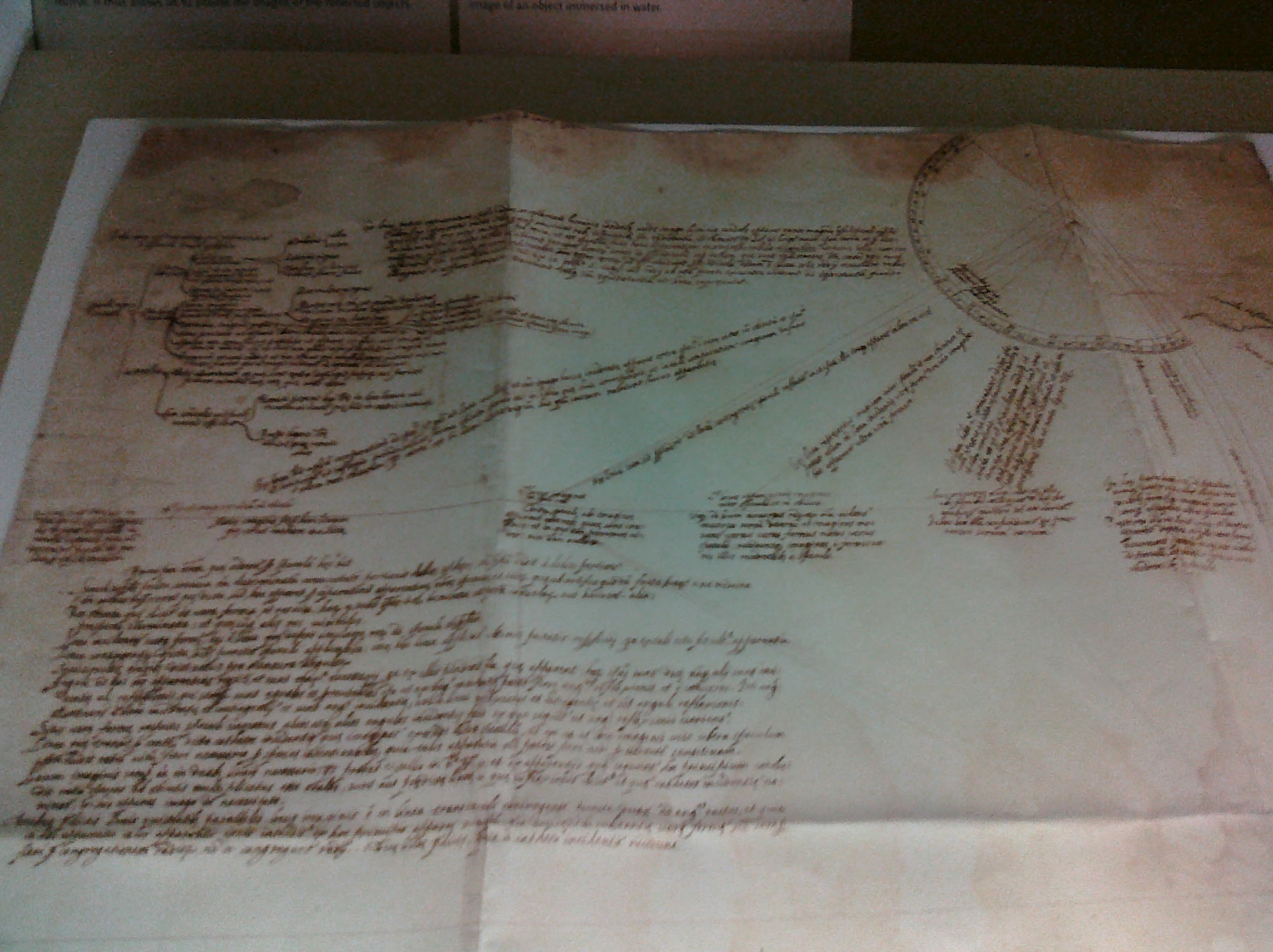 A manuscript copy of the diagram that combines “in an innovative manner” burning properties and those relevant to the formation of images in a concave (bulging inward, or converging) spherical mirror, thus allowing us to situate images of reflected objects.