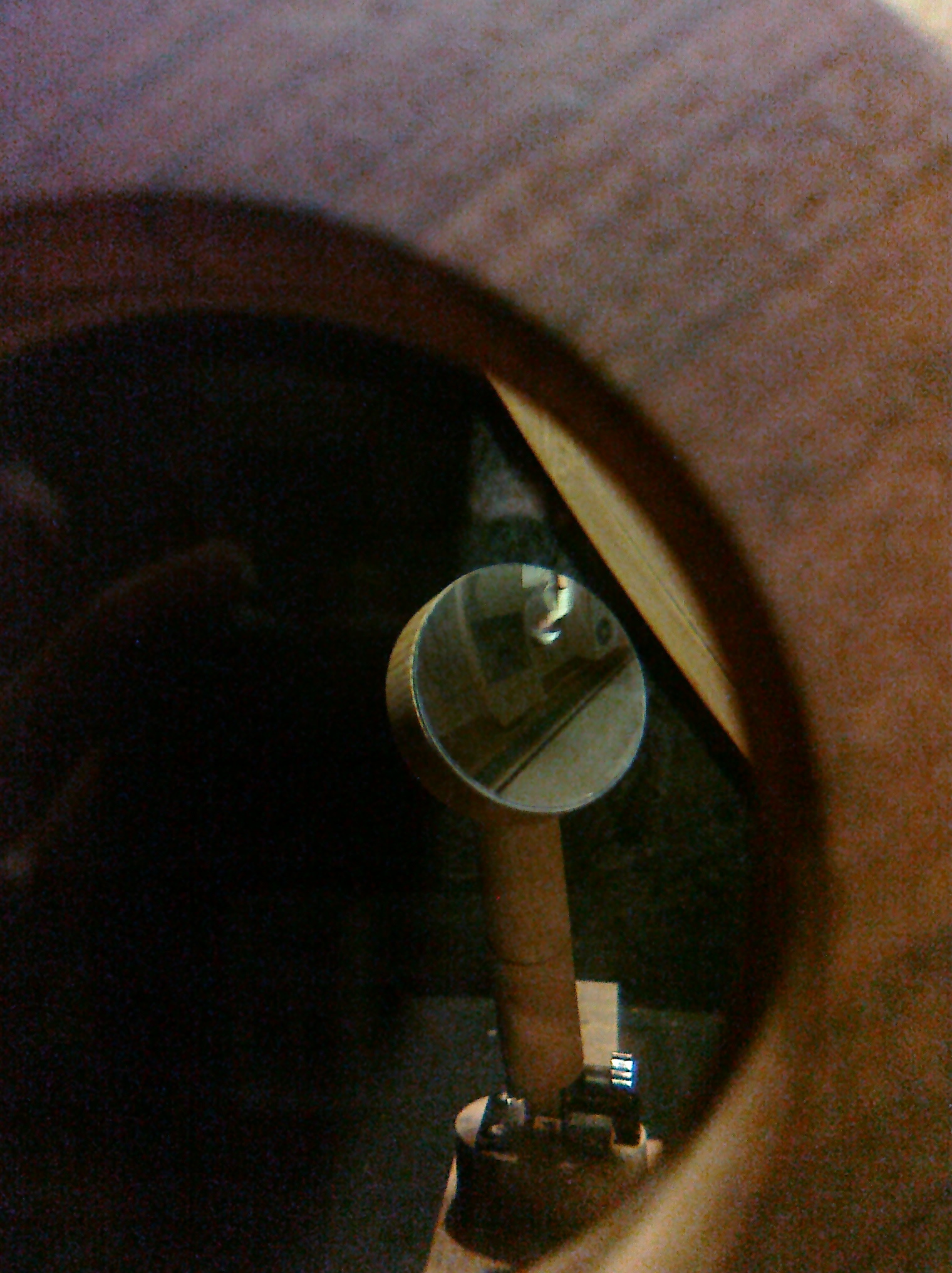 Newton. The objective mirror is concave, the secondary mirror is inclined 45 degrees and is plane. Light rays converge toward the focal point of the objective, are deviated laterally by the inclined mirror, and become parallel again by the bi-convex eyepiece. Since rays cross, the image is inverted.