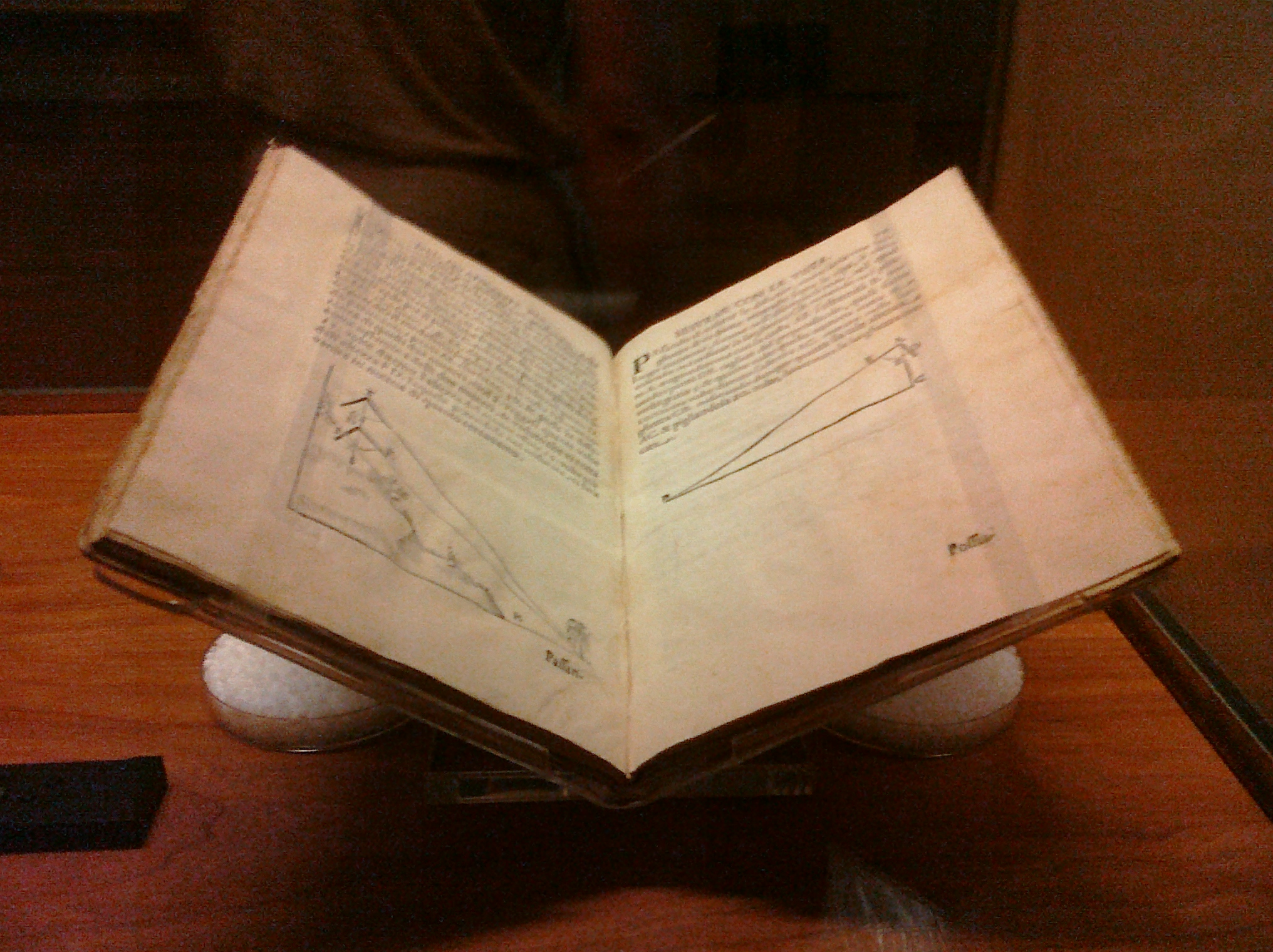 Let's start with some "mathematical fun." No, that isn't a typo or a paradox. Cosimo de' Medici owned the book pictured below, which was designed for him to have "fun" with his education. It describes the operations of the first instrument for multifunctional calculation of Modern Age. You can see the illustration, which depicts its use for measuring the height of a mountain.