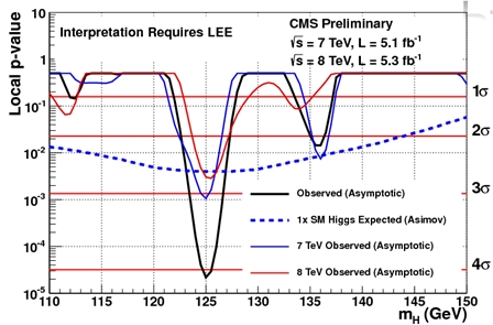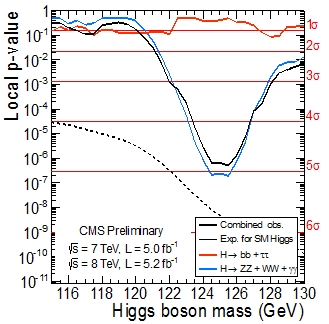 So CMS by combining 2011 and 2012 gets to over 4-sigma by this channel alone. In the figure you see the p-values of the 2011 and 2012 data separately, and combined. The 135 GeV thing is shown to be a fluctuation, while the 125 GeV signal strengthens to a observation-level significance.