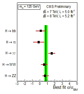 The cross section of the Higgs measured by CMS is in very good agreement with SM predictions. Below you can see a breakdown of the measurement (which globally is 0.80+-0.22 times the SM) in the various decay modes.