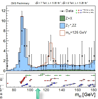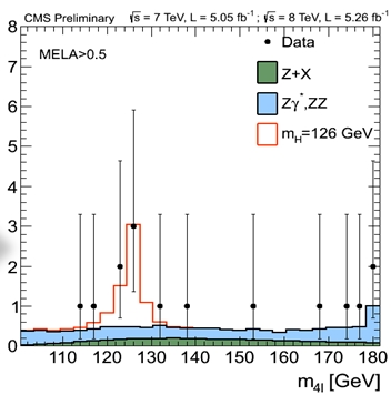 In the decay channel involving two Z bosons further decaying into four leptons, the signal is numerically smaller but the signal to noise ratio is higher. The mass distribution found by combining the 2011 and 2012 data, after a careful blind reoptimization of the search strategy, is the one shown below.