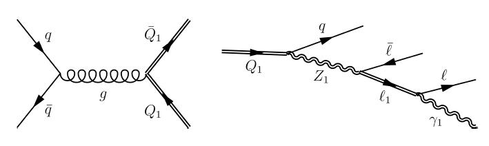 Not in the DZERO search: the masses of the KK particles might be such that the produced cascade decays do not yield a significant missing energy. The considered model sees the creation of KK quark-antiquark pairs, which decay yielding charged leptons and quarks. The most striking signature arising from such a process might be the presence of pairs of same-sign lepton pairs (from one of the decay chains depicted in the diagram above, or from two separate decays of KK quarks).