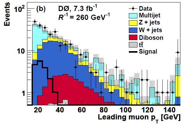 DZERO sought for same-sign lepton pairs of small transverse momentum, which could be sizably contributed by the KK decays. If you look for same-sign electrons or muons (or electron-muon final states) at a hadron collider, you are going to have to fight backgrounds which come mainly from electroweak processes such as W+jets, Z+jets, and diboson processes; plus of course QCD processes yielding fake leptons. This is what appears from the graph below, showing the transverse momentum of the leading muon in the event (I should have said earlier that DZERO base their search on a sample of events collected by a inclusive muon trigger - so a muon is always present there).