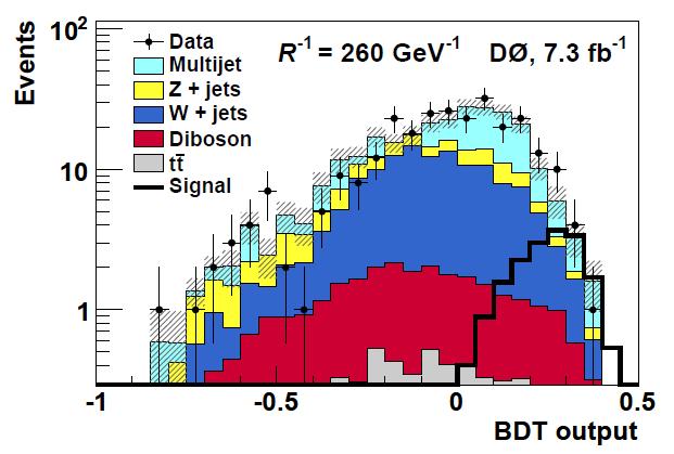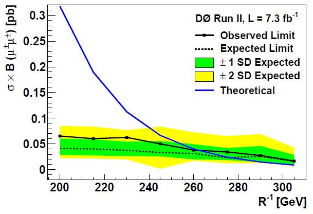 Fitting the output of the BDT allows DZERO to place upper limits on the possible signal contamination. When compared with the expected signal cross section, which is a function of the compactification parameter R, one gets a lower limit on R. This is shown in the figure below, where the green-and-yellow band shows the predicted range of upper limits that the analysis could set, given the amount of analyzed data and the search technique. Since the masses of KK particles depend on R, the R limit allows to exclude masses of the new KK quarks below 317 GeV, which is the best way of summarizing the search result.