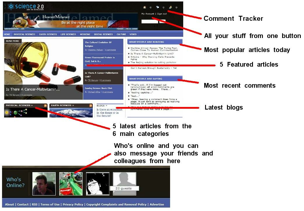 There are two sections in Science 2.0: The front pages and their contents are created by researchers, book authors, journalists and contributors who are well-established but many were not well-known when they started. To get known, you have a Corkboard on your Profile and everyone who has an account can create content in the Science 2.0 Forum (within reason: see The Details of Science 2.0 below). So this section is just to familiarize you with the layout of the site. Boring stuff about history is way down at the bottom.