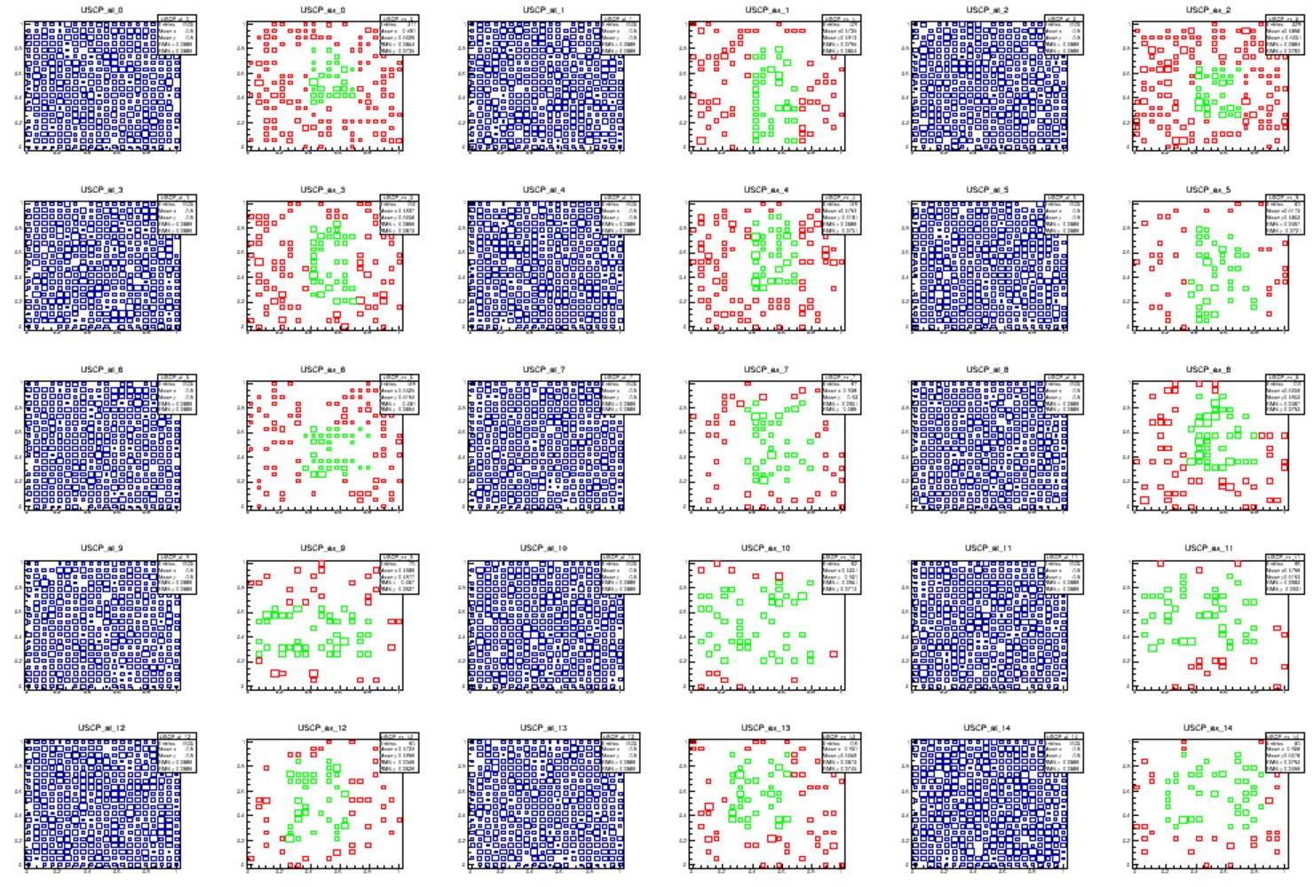 Below, the first graph shows two-dimensional scatterplots of each pair of the six features: 2 vs 1, 3 vs 1, 4 vs 1, 5 vs 1, 6 vs 1, 3 vs 2, 4 vs 2, 5 vs 2, 6 vs 2, 4 vs 3, 5 vs 3, 6 vs 3, 5 vs 4, 6 vs 4, and 6 vs 5. These are shown left to right and top to bottom. There are two plots for each pair of variables: the first, in blue, shows the full dataset; the second shows in green only the data in the selected "overdense" box, and in red the data that pass criteria for being in the overdense box in all the four features not displayed in each of the graphs.