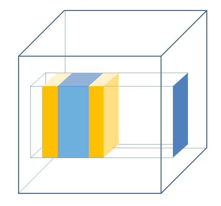 (Above, the xy dimensions define the blue square projected on the right side. This projects in the additional dimensions - here only a third one - where a hyper-rectangle defines a region of interest, shown in lighter blue. The "sidebands" in orange have same volume and for a smoothly varying density distribution should contain approximately the same data as the blue box).