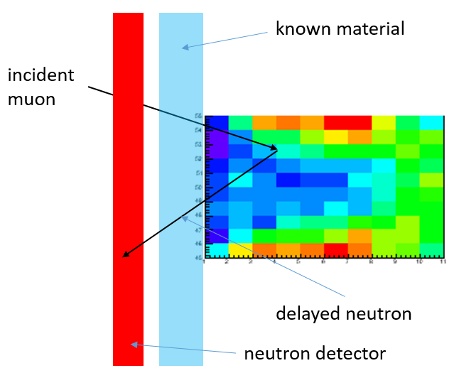 Negative muons may be shot into the surface through the detection system, and if they have the right energy they will stop in there. Then, the magic happens: they spiral into the nucleus, emit X rays, and then turn a proton into a neutron; the neutron, half of the time, emerges back up (if it can travel far enough, which also depends on the composition of the material) and gives a signal in the neutron detector.