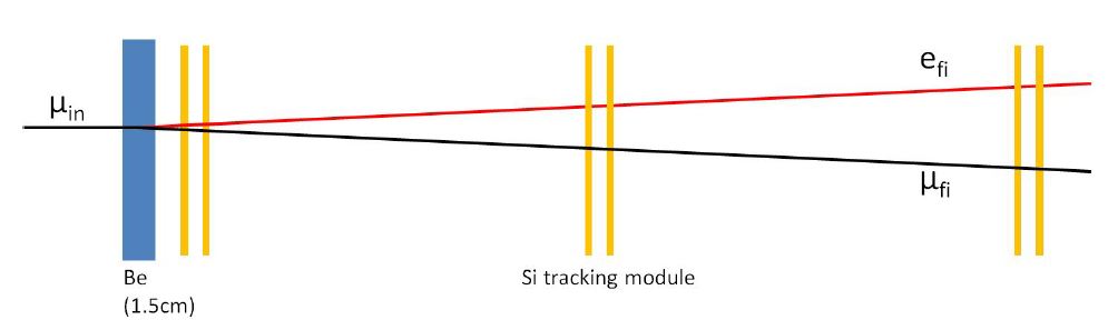 The experiment is planned to be built at CERN, where a beam of 150 GeV muons with suitable intensity is available. Since you need to track particles without affecting their direction (so that you can precisely estimate angles), the setup foresees the use of precise silicon microstrip detectors, which collect in densely arranged strip electrodes the ionization charge left by the electrically charged particles as they traverse 320-micron-thick silicon sensors. The strips are separated by 90 microns; by alternating layers where strips are laid in one direction and in the orthogonal one, one gets to 3D-track the ionizing particles with position uncertainties in the 10-micron range.