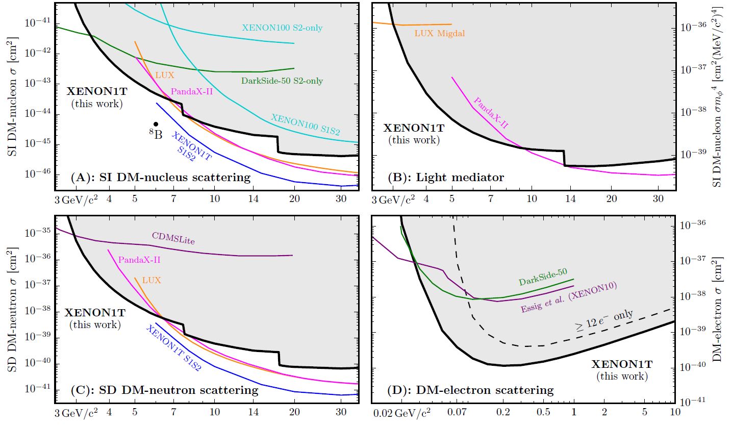 By the same token, on the top right you see that in the same mass range the new XENON result extends down the cross section limit by up to two orders of magnitude, for models which include the existence of a light mediator in the DM-matter interaction.